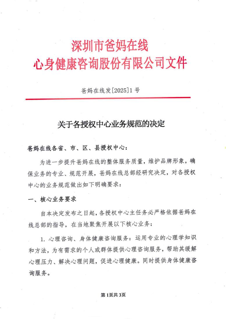 自本決定發(fā)布之日起,各授權(quán)中心主任務必嚴格依據(jù)爸媽在線總部的指導,在當?shù)鼐劢归_展以下核心業(yè)務: