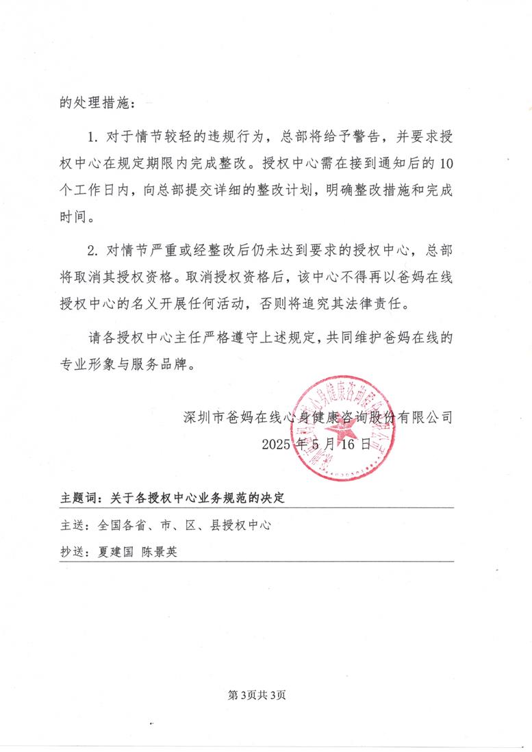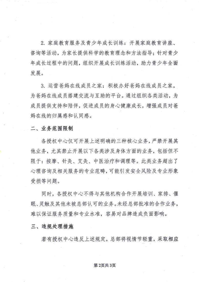 2. 對情節(jié)嚴重或經(jīng)整改后仍未達到要求的授權(quán)中心,總部將取消其授權(quán)資格。取消授權(quán)資格后,該中心不得再以爸媽在線授權(quán)中心的名義開展任何活動,否則將追究其法律責任。